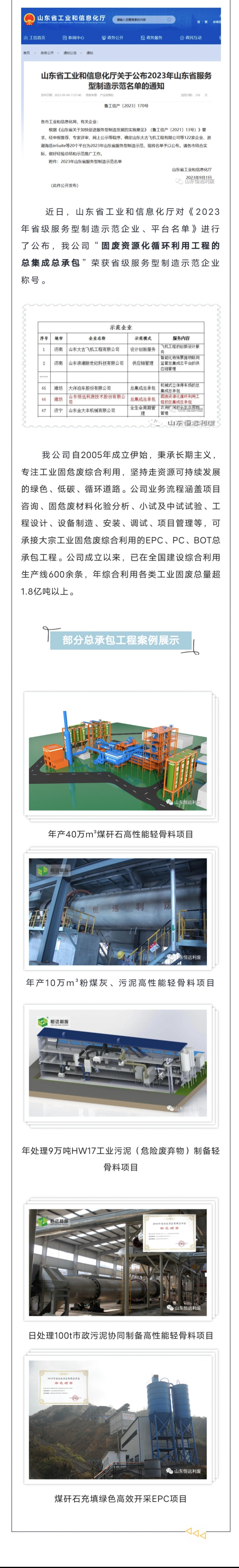 【喜訊】我公司“固廢資源化循環(huán)利用工程的總集成總承包”榮獲山東省服務(wù)型制造示范企業(yè)稱號