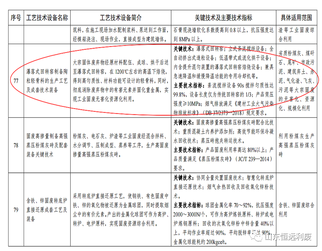 近日,工業(yè)和信息化部、國(guó)家發(fā)展和改革委員會(huì)、科學(xué)技術(shù)部、生態(tài)環(huán)境部四部聯(lián)合編制發(fā)布了《國(guó)家工業(yè)資源綜合利用先進(jìn)適用工藝技術(shù)設(shè)備目錄(2021年版)》(以下簡(jiǎn)稱(chēng)“目錄”)。山東恒遠(yuǎn)利廢公司研發(fā)推廣的“瀑落式回轉(zhuǎn)窯制備陶粒輕骨料的生產(chǎn)工藝及成套技術(shù)裝備”入選該目錄第77項(xiàng),隸屬于該目錄第三部分推廣類(lèi)之第二項(xiàng)工業(yè)固廢綜合利用。
