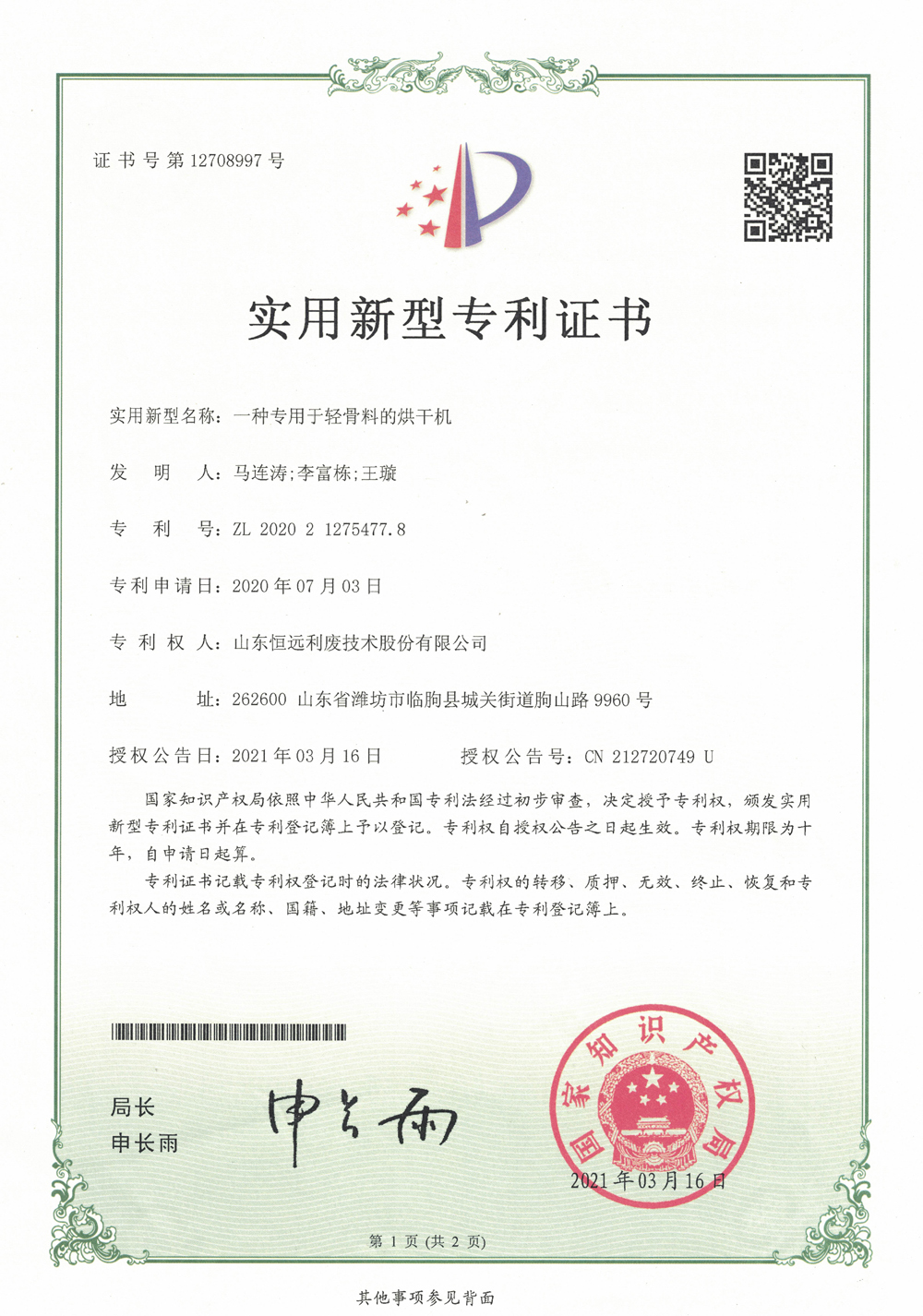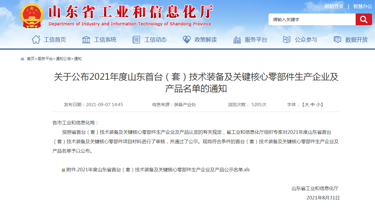 入選2021年度山東省首臺(套)技術(shù)裝備和關(guān)鍵核心零部件推廣應(yīng)用指導(dǎo)目錄