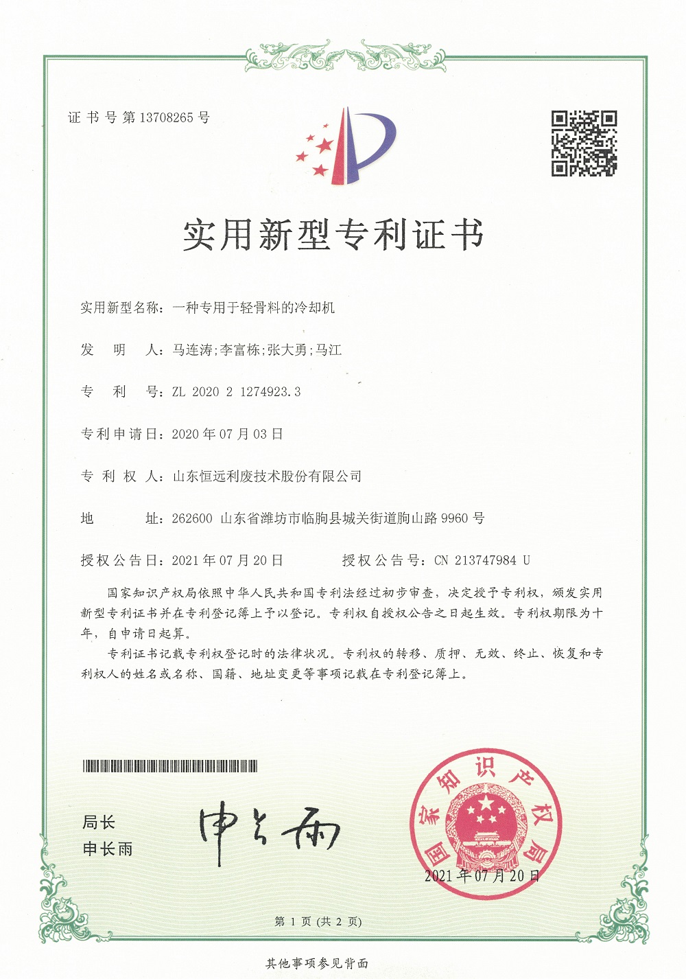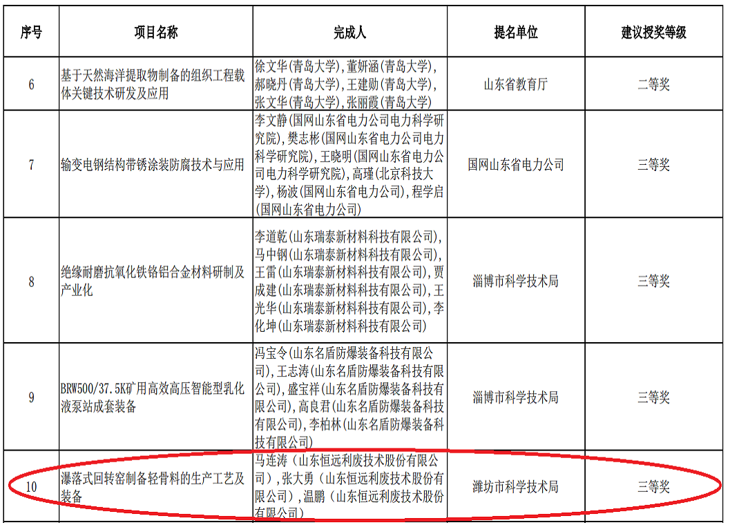 2021年9月,我公司瀑落式回轉(zhuǎn)窯制備輕骨料的生產(chǎn)工藝及裝備入選2021年度山東省技術(shù)發(fā)明獎。