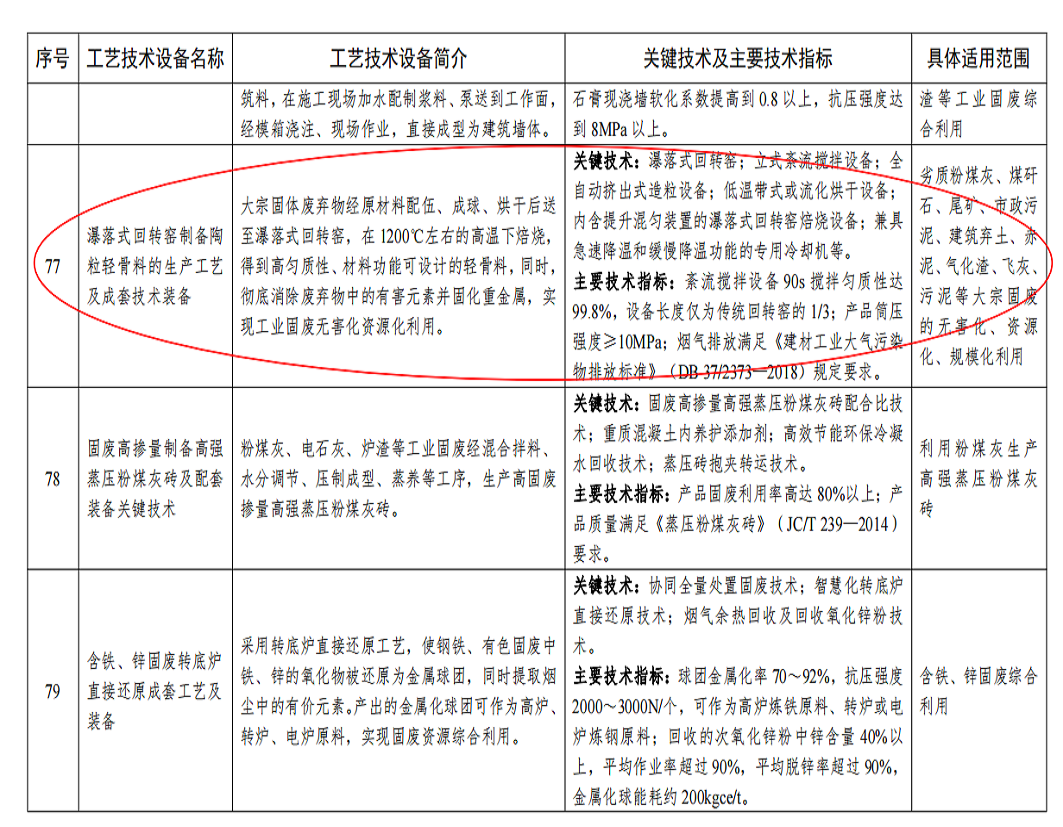 2021年11月,我公司研發(fā)推廣的“瀑落式回轉(zhuǎn)窯制備陶粒輕骨料的生產(chǎn)工藝及成套技術(shù)裝備”入選工業(yè)和信息化部、國家發(fā)展和改革委員會、科學(xué)技術(shù)部、生態(tài)環(huán)境部四部聯(lián)合編制發(fā)布的《國家工業(yè)資源綜合利用先進適用工藝技術(shù)設(shè)備目錄(2021年版)》。