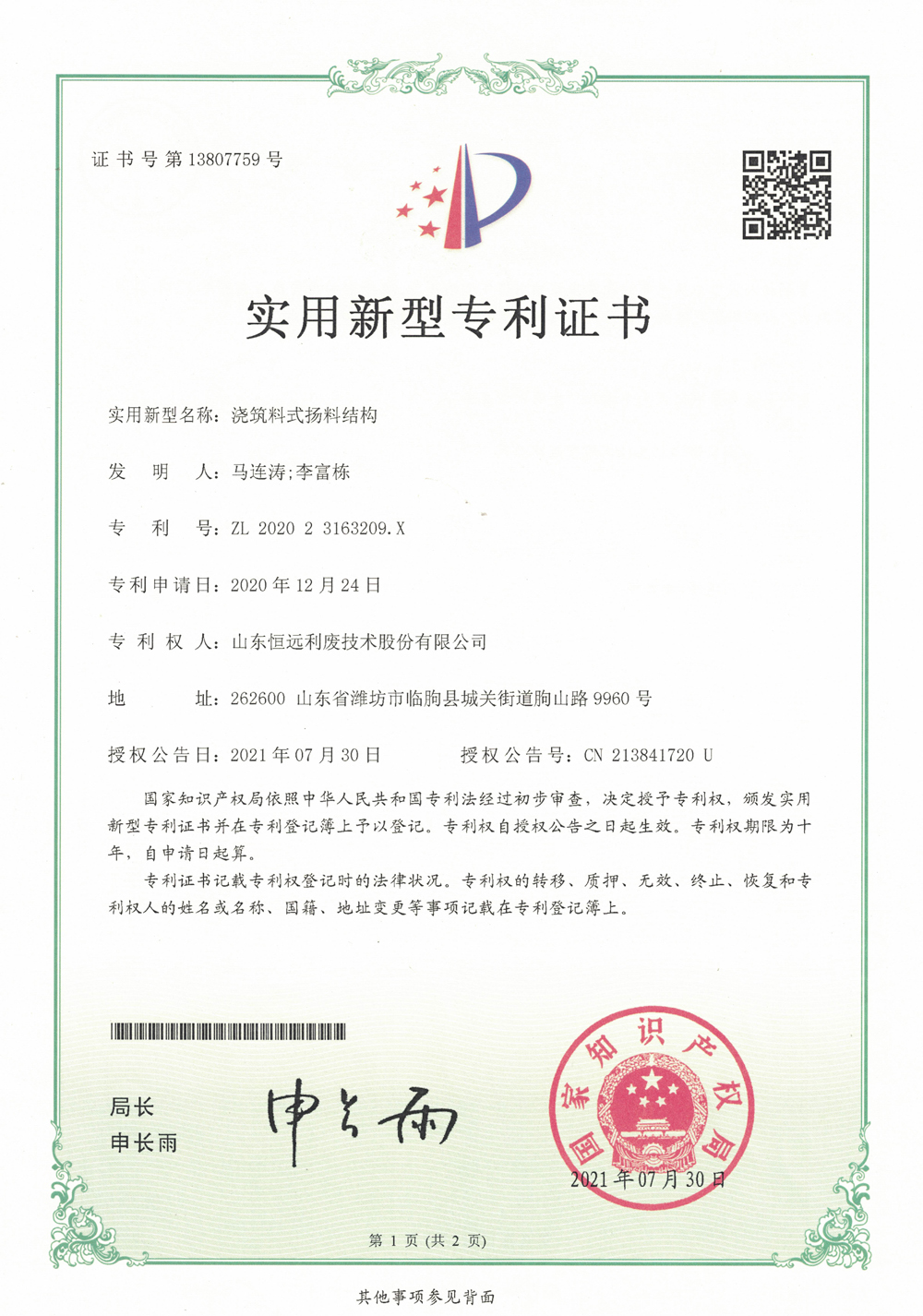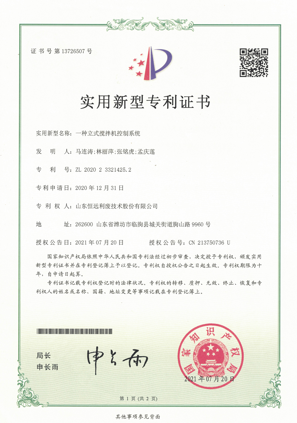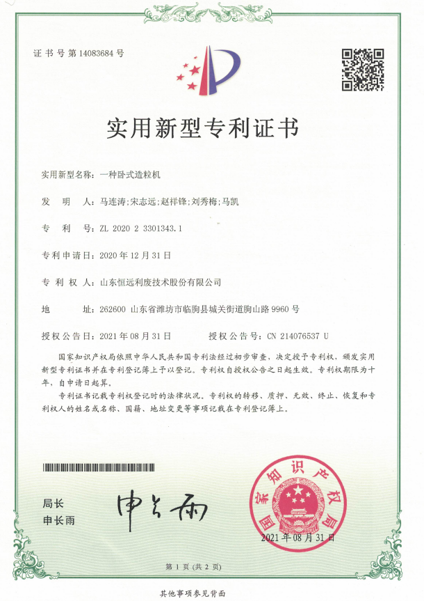 2021年,我公司新獲授權(quán)專利5項:一種立式攪拌機的控制系統(tǒng)、一種專用于輕骨料的烘干機、一種專用于輕骨料的冷卻機、一種臥式造粒機、澆注料式揚料結(jié)構(gòu)。另有6項專利已獲受理,尚待流程審核中。