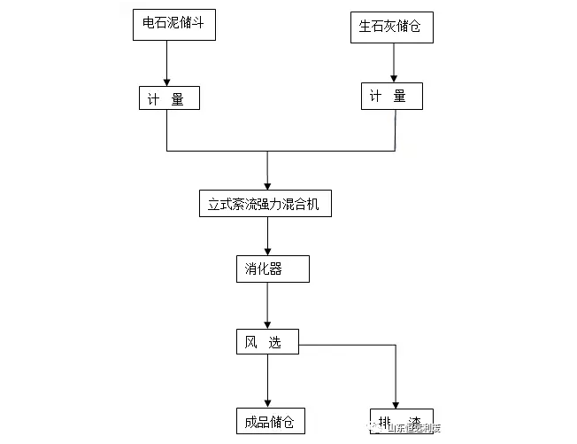 2、工藝過程簡(jiǎn)述:電石泥于石灰分別在儲(chǔ)料斗和儲(chǔ)倉(cāng)中存儲(chǔ),通過計(jì)量設(shè)備計(jì)量后輸送到強(qiáng)力混合設(shè)備中;生石灰經(jīng)過破碎后在儲(chǔ)倉(cāng)中暫存,通過計(jì)量后輸送至強(qiáng)力混合設(shè)備;以上兩種物料同時(shí)進(jìn)入強(qiáng)力混合設(shè)備后,經(jīng)過高速紊流強(qiáng)力混合,使之充分完全的接觸后開始消化反應(yīng),由于條所述原理的存在,兩種物料獲得理想的均化效果。均化后的物料再經(jīng)過四級(jí)消化器的進(jìn)一步消化與除濕,通過風(fēng)選設(shè)備進(jìn)行分級(jí),可按照需要的顆粒等級(jí)進(jìn)行分類儲(chǔ)存,不合格顆粒返回混合設(shè)備重新進(jìn)行消化或者從排渣口排出。